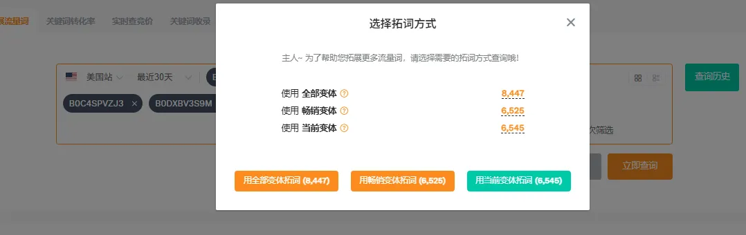 拓词方式选 “全部变体”:能覆盖竞品所有变体的流量词,比如我们反查 10 个 ASIN,用全部变体拓词拿到了8,447 个初始关键词,比 “畅销变体”(6,525 个)多 30% 的词量;