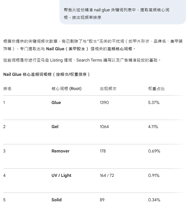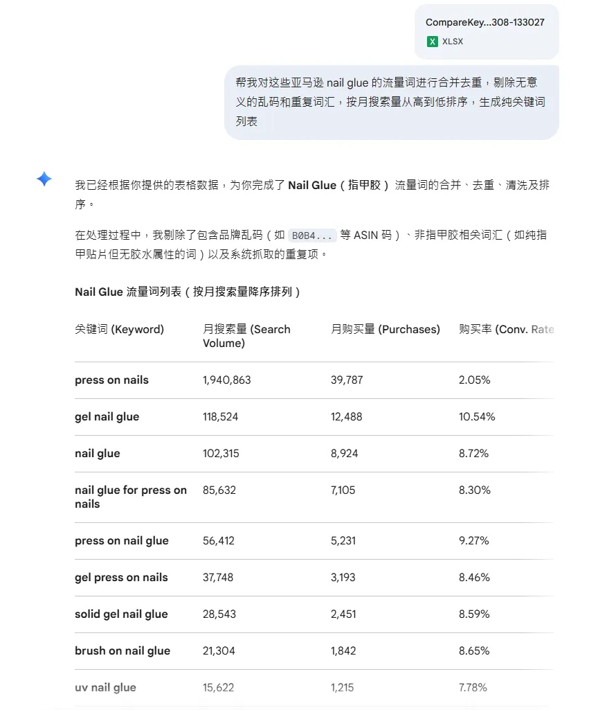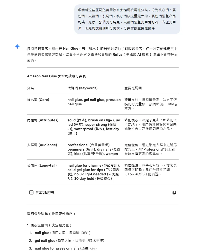 将卖家精灵导出的原始词表复制给 Gemini,下达指令:“帮我对这些亚马逊 nail glue 的流量词进行合并去重,剔除无意义的乱码和重复词汇,按月搜索量从高到低排序,生成纯关键词列表”,AI 可在 1 分钟内完成人工半小时的整理工作,直接得到结构化初始词库。