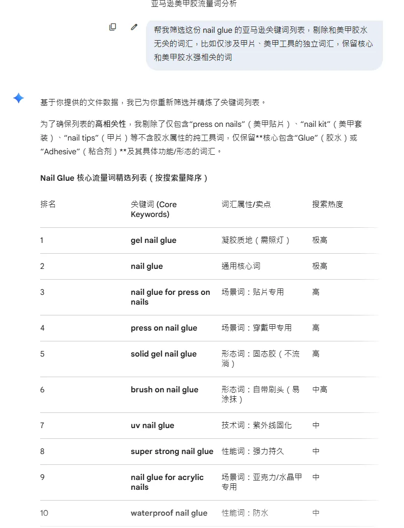 向 Gemini 下达精准指令:“帮我筛选这份 nail glue 的亚马逊关键词列表,剔除和美甲胶水无关的词汇,比如仅涉及甲片、美甲工具的独立词汇,保留核心和美甲胶水强相关的词”
