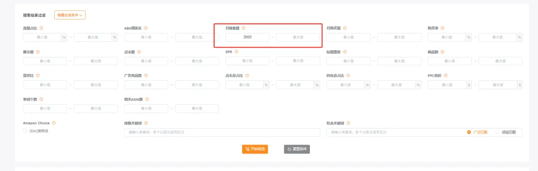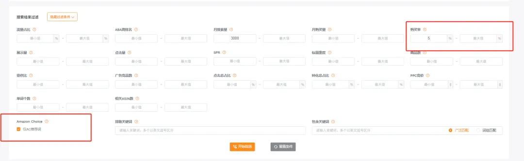 打开卖家精灵【拓展流量词】的过滤功能,设置硬指标淘汰低价值词,不同类目可灵活调整: