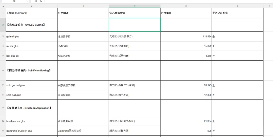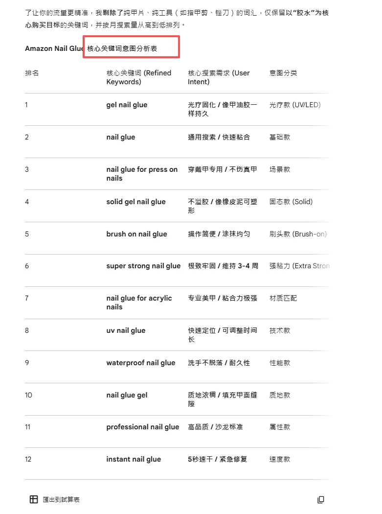 向 Gemini 下达指令:“帮我将这些精准的 nail glue 关键词制作成 Excel 格式的词表,包含列名:关键词、中文翻译、核心搜索需求、月搜索量、是否为 AC 推荐词,按核心搜索需求分类排序”,AI 可直接生成带格式的词表内容,复制到 Excel 即可使用,省去人工整理标注的大量时间。