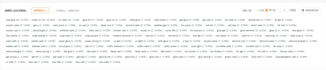 “帮我从这份精准 nail glue 关键词列表中,提取高频核心词根,按出现频率排序”