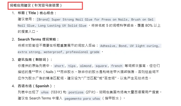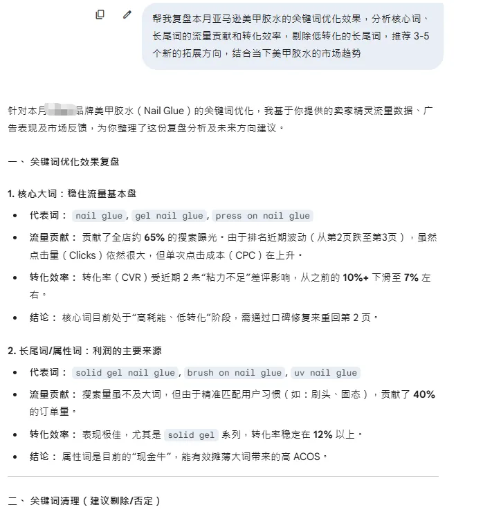 每月将关键词的排名、流量、转化数据发给 Gemini,下达指令:“帮我复盘本月亚马逊美甲胶水的关键词优化效果,分析核心词、长尾词的流量贡献和转化效率,剔除低转化的长尾词,推荐 3-5 个新的拓展方向,结合当下美甲胶水的市场趋势”