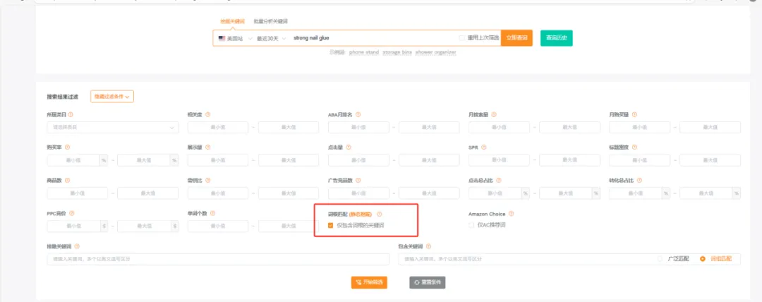 把高频词根(比如 “strong nail glue”)逐个输入卖家精灵【关键词挖掘】,选择 “长尾词挖掘” 模式 —— 系统会在词根前、中、后补词,生成更多细分词。