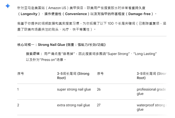将高频词根发给 Gemini,下达个性化指令:“以 strong nail glue、gel nail glue 为核心词根,拓展亚马逊美甲胶水的长尾关键词,要求贴合欧美用户的真实搜索习惯,词长 3-5 个单词,覆盖产品属性(如刷头、光疗、快干、无 UV 灯),每个词根拓展 50 个,剔除重复词”