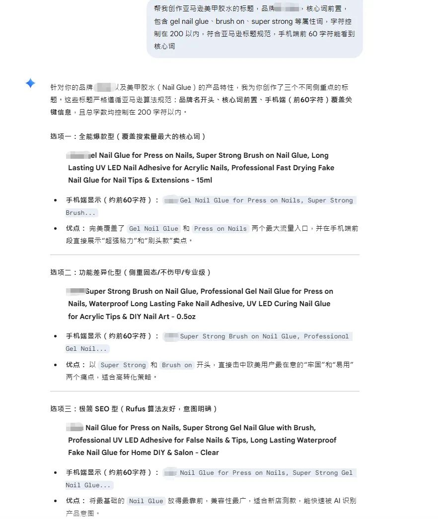 向 Gemini 下达指令:“帮我创作亚马逊美甲胶水的标题,品牌名 AAA,核心词前置,包含 gel nail glue、brush on、super strong 等属性词,字符控制在 200 以内,符合亚马逊标题规范,手机端前 60 字符能看到核心词”
