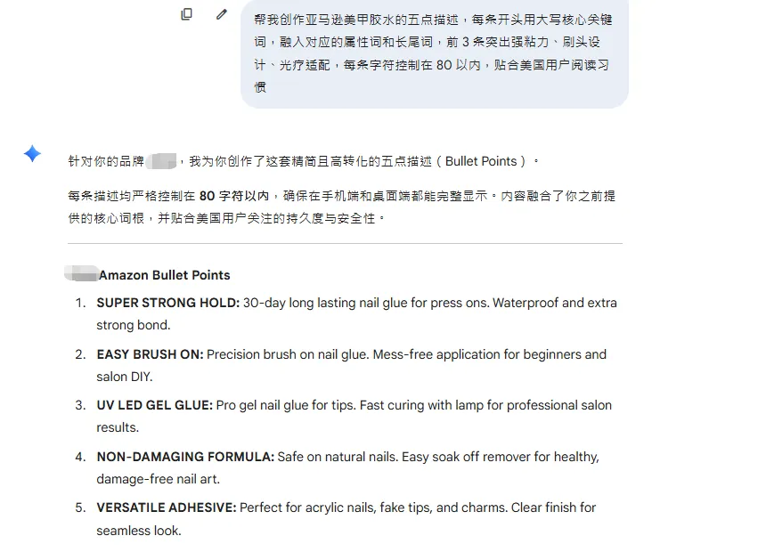 向 Gemini 下达指令:“帮我创作亚马逊美甲胶水的五点描述,每条开头用大写核心关键词,融入对应的属性词和长尾词,前 3 条突出强粘力、刷头设计、光疗适配,每条字符控制在 80 以内,贴合美国用户阅读习惯”