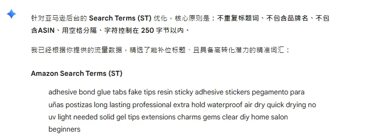 Search Term:250 字符内,让 Gemini 指令:“帮我整理美甲胶水的 Search Term,包含所有核心词、属性词和高转化长尾词,无堆砌,字符控制在 250 以内,用空格分隔”