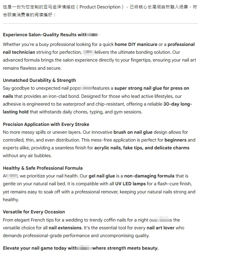 详情描述:让 Gemini 按 “场景化” 创作,融入长尾词,指令:“帮我创作亚马逊美甲胶水的详情描述,场景覆盖居家美甲、专业美甲店,融入 super strong nail glue for press on nails 等长尾词,语言流畅,不堆砌关键词,字数 300 左右”,AI 生成初稿,人工补充产品参数即可: