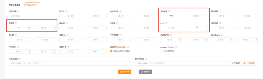 通过设置月搜索量>1000, 购买率>10% ,且SPR <50 ,筛选出购买率高且只需较低单量就能进入到首页的关键词。 (筛选条件仅供参考,请结合您的实际情况填写)