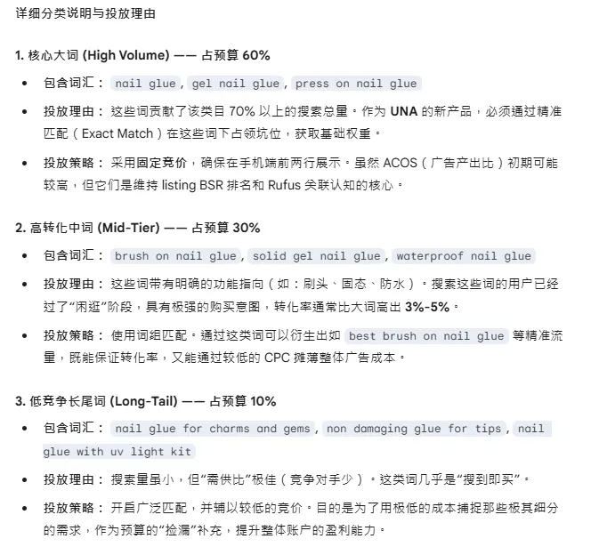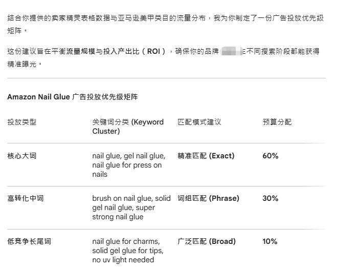 将卖家精灵筛选出的广告词发给 Gemini,下达指令:“帮我分析这些亚马逊美甲胶水广告词的投放优先级,按‘核心大词(精准投放)、高转化中词(词组投放)、低竞争长尾词(广泛投放)’分类,同时给出广告预算分配建议,核心大词占比 60%,中词 30%,长尾词 10%,说明每个分类的投放理由”