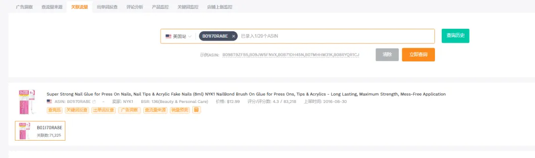举个例子,搜索 “nail glue” 后,我们能收集到这些优质竞品 ASIN:B01I70RA8E(近 30 天销量 7万 +)、B0B4PSY5SL(近 30 天销量 3 万 +),这些都是高流量标杆。