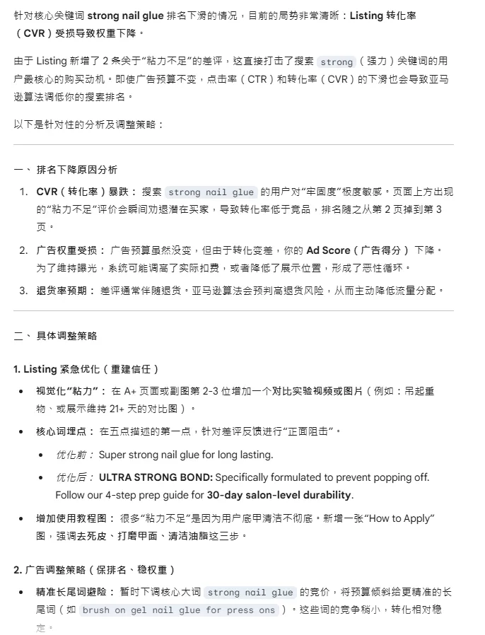 将卖家精灵的监控数据整理后发给 Gemini,下达具体指令,比如:“我的美甲胶水核心词 strong nail glue 近 7 天排名从第 2 页降到第 3 页,广告预算未变,Listing 新增 2 条差评(反馈粘力不足),帮我分析排名下降的原因,并给出具体的调整策略,包含 Listing 优化、广告调整、差评应对”