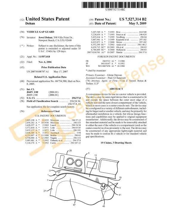 原告 JONATHAN KOTYK 是本案专利的受让人,案件涉及专利产品是是一款车辆间隙防护物,将其插入座椅和中控台之间的缝隙中,能有效防止手机、钥匙、硬币和其他小物品滑入汽车座椅缝隙中。由于是发明专利维权,类似材质和使用方法等均有侵权可能,请相关卖家注意排查避雷!