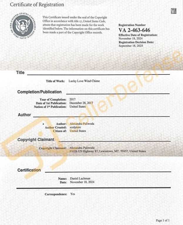 原告 Alexandra Paliwoda 是一位来自美国的专业艺术家,其作品以金属工艺和乡村元素为特色。本案涉及产品是一款铁艺风铃,同款众多请注意排查避下架!
