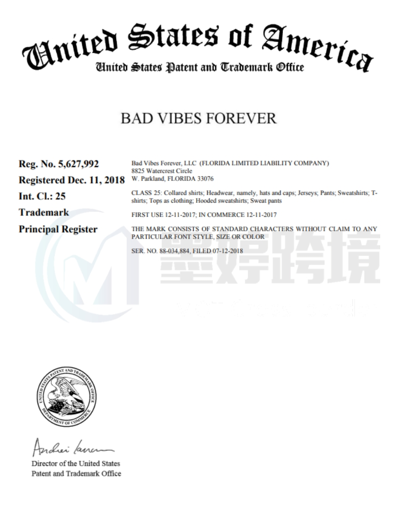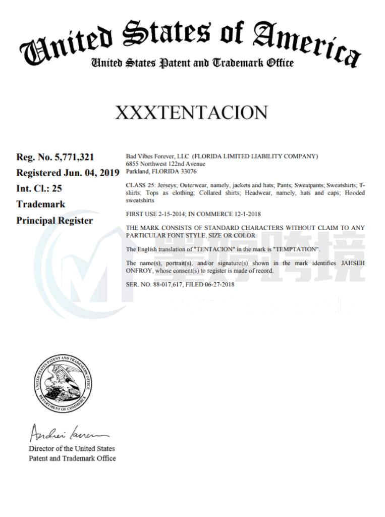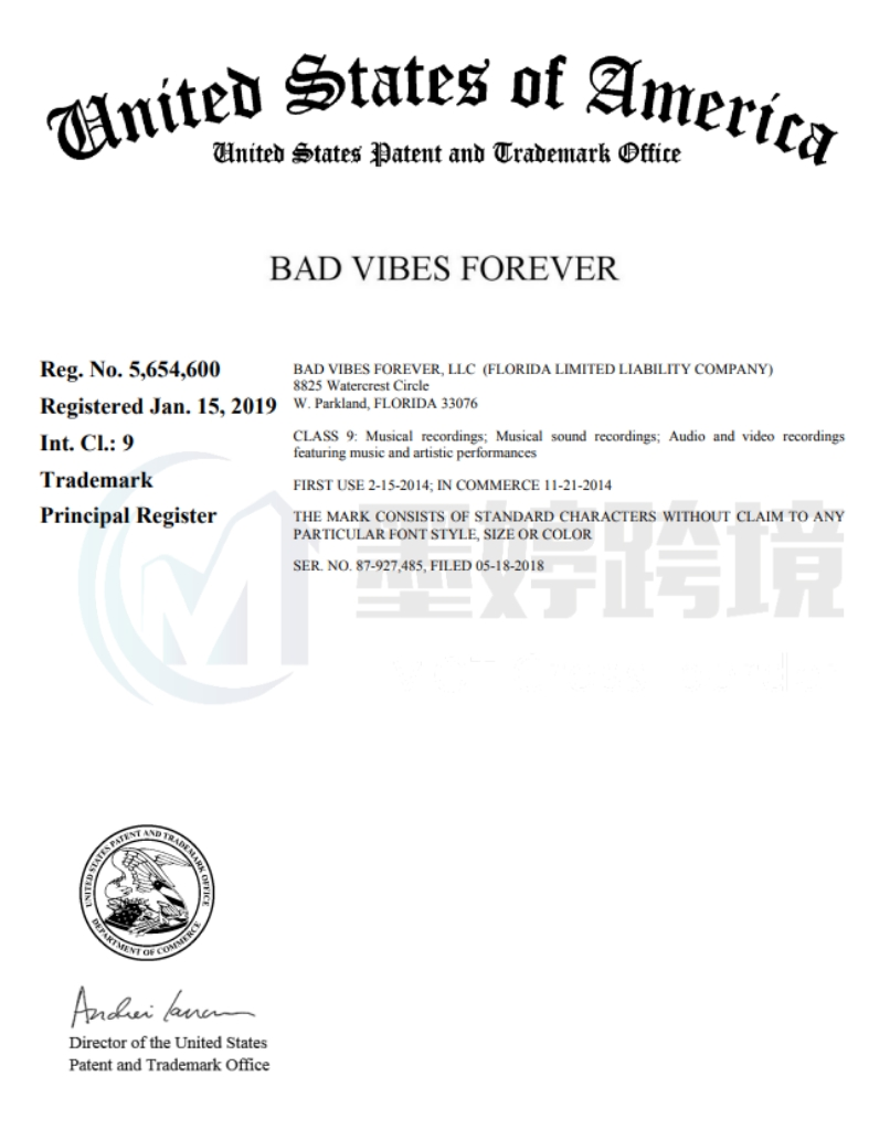 目前,XXXTentacion的相关品牌与商业权益由 Bad Vibes Forever, LLC 管理。该公司围绕“Bad Vibes Forever”与“XXXTentacion”等核心商标,推出音乐、服饰、周边衍生品等产品,并通过版权及商标进行积极保护。