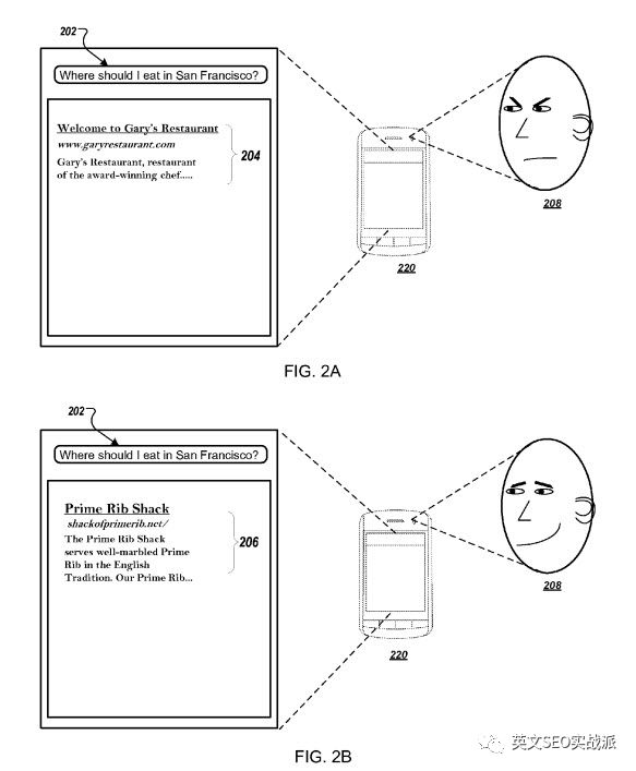 这是一个我怀疑Google是否会广泛应用的专利。根据这项专利,Google可以在用户输入关键词之后,打开手机或者电脑的前置摄像头,通过面部识别观察用户是否对显示的结果满意。如果用户对搜索结果中的某个结果感到不满意的话,那么Google就会降低该页面的权重。