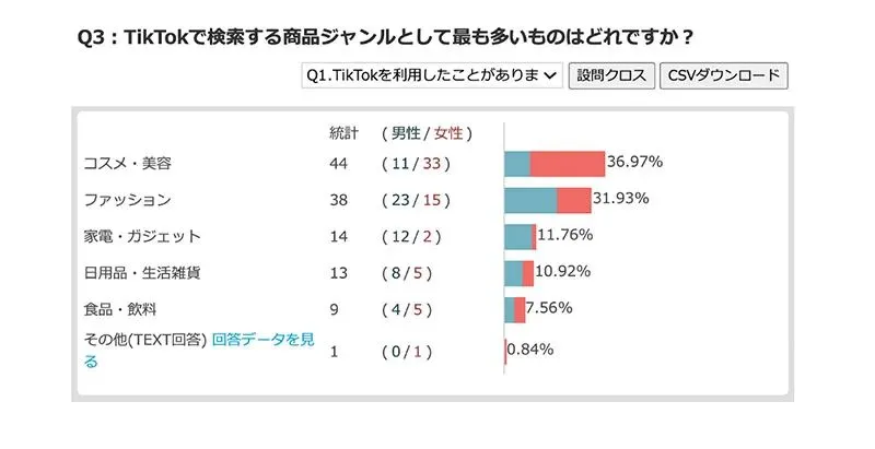 受访者表示:在TikTok上搜索量最高的商品类别是化妆品和美容,共有44人搜索(11名男性/33名女性)。其次是时尚类商品,共有38人搜索(23名男性/15名女性),这表明与外在形象相关的类别是搜索的重点。