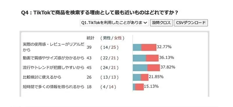 在TikTok上搜索产品的最常见原因是“容易跟上潮流”(37.82%)、“可以通过视频感受质地和尺寸”(36.13%)以及“使用体验和评价真实可靠”(32.77%)。这表明,视频形式特有的信息价值备受重视。