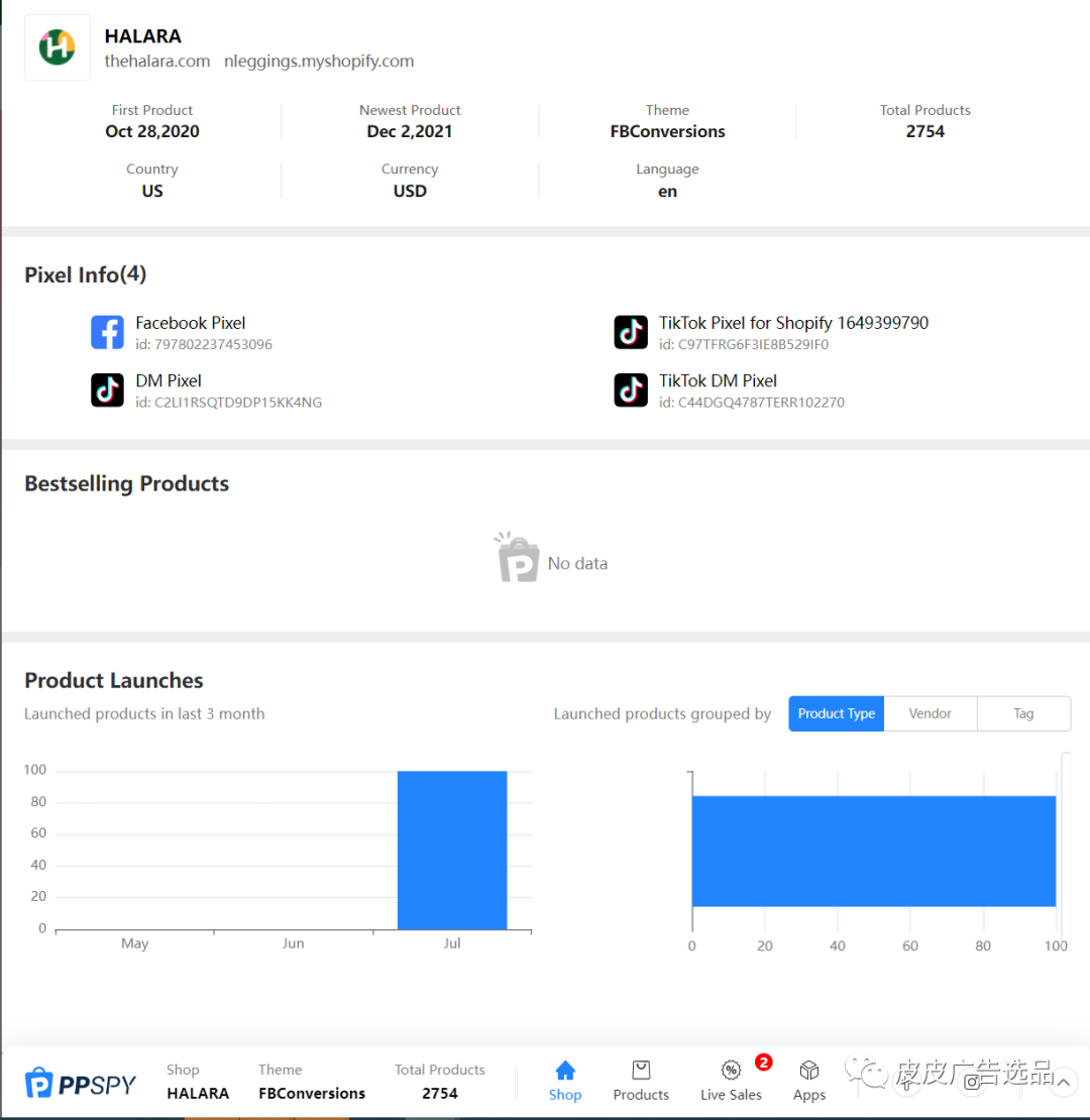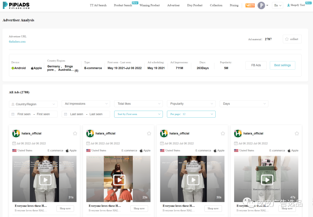 通过PIPIADS广告大数据检测,Halara在TikTok上投放了很多广告,目前网站平均一天几万单