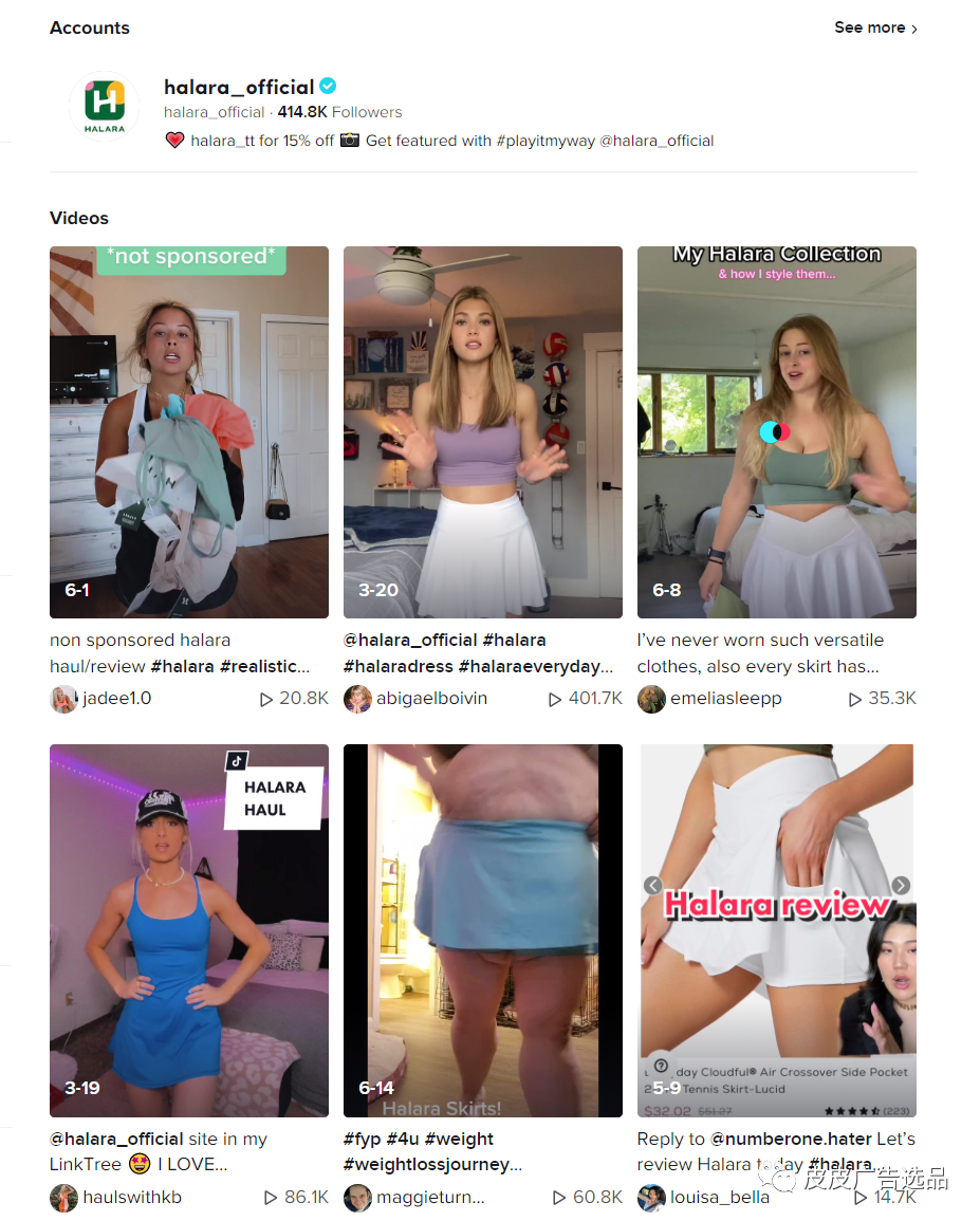 不难看出Halara把TikTok作为重要的渠道在布局营销像Halara这样细分领域的新兴品牌前期会通过砸钱投广告,靠优质的产品+实惠的价格,逐渐打开悠闲运动服饰类目下的品牌知名度