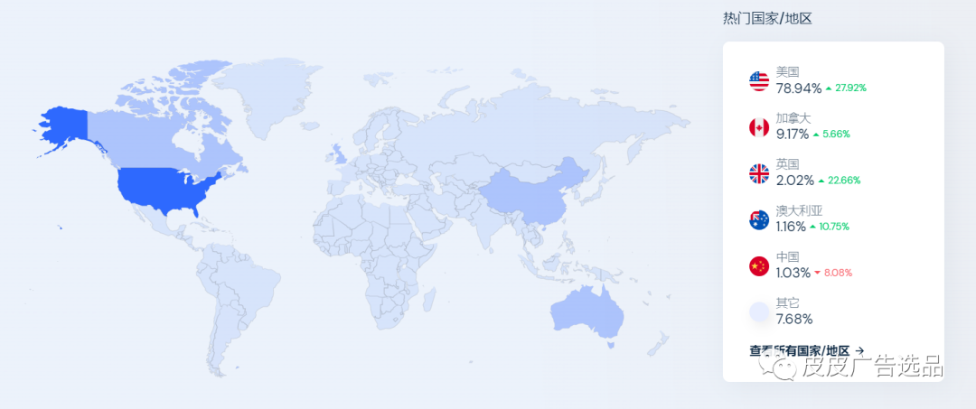 美国是主要市场,流量占比78.94% 其次加拿大,流量占比9.17%
