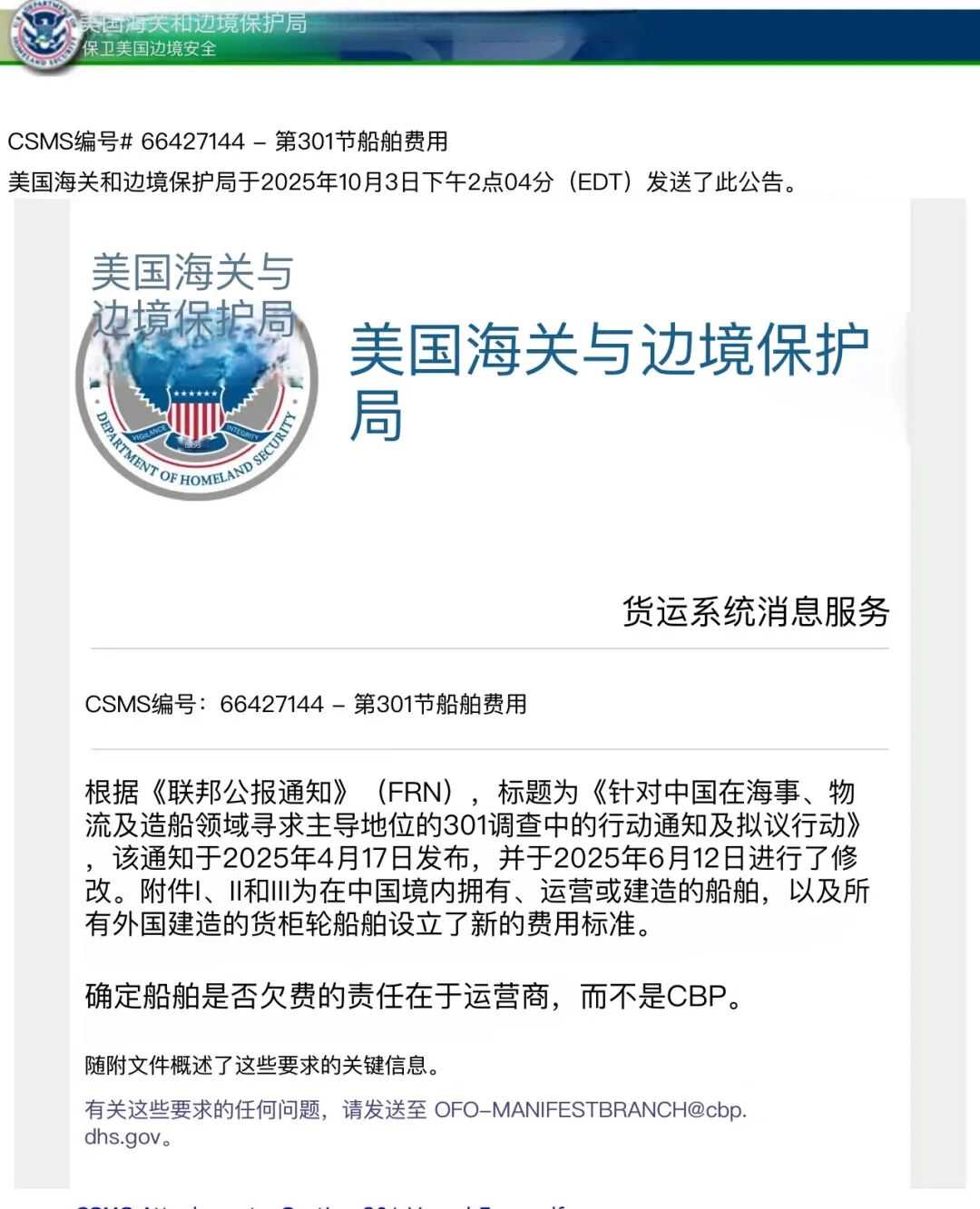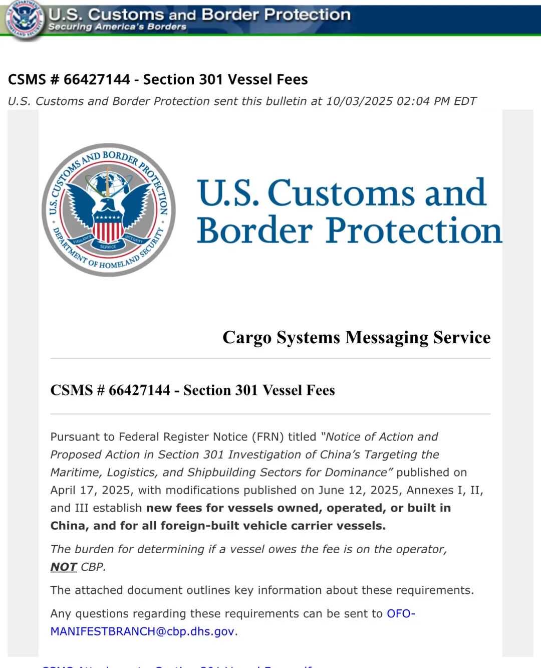 美国海关与边境保护局(CBP)于10月3日发布了针对特定船舶的港口收费细则,并着重强调:判定船舶是否需要缴费的责任在运营商,而非CBP。