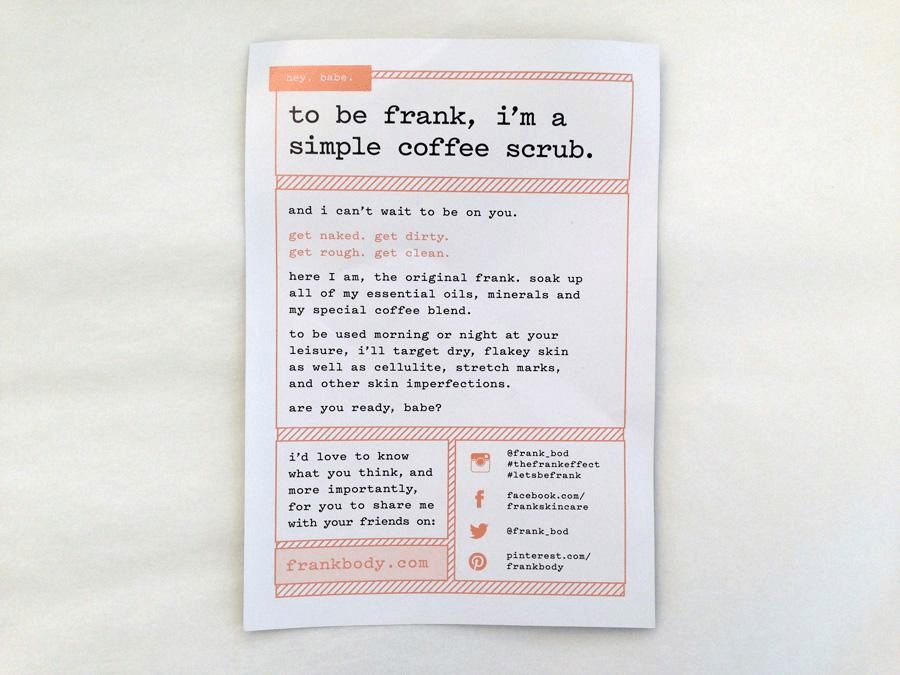 实话说这种营销手法不是一个新概念,但它却是一个令人耳目一新的想法。正如苹果就是电脑公司,谷歌就是做搜索的,亚马逊就是卖书的,而Frank Body就是卖咖啡磨砂膏的。