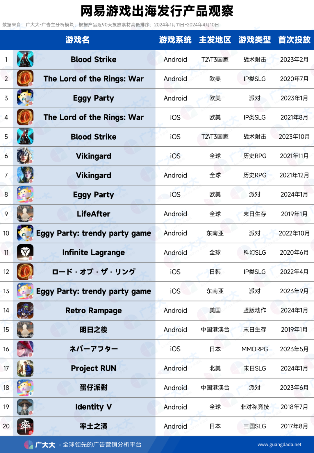 此外【蛋仔派对】【指环王:纷争】也是网易近期推广的重点产品。