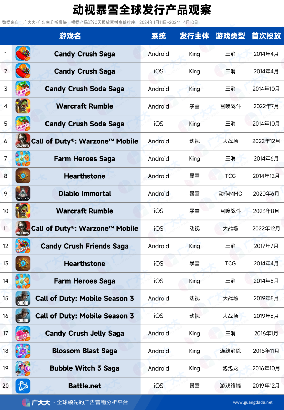 相比于网易在移动游戏上的全能,动视暴雪的表现只能说是勉勉强强。在手游领域最能打的要数暴雪在2015年收购的【Candy Crush Saga(糖果粉碎传奇)】研发商King,其次就要数和网易共同研发的【暗黑破坏神:不朽】。