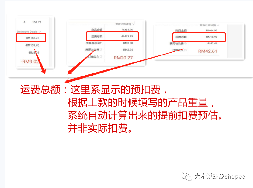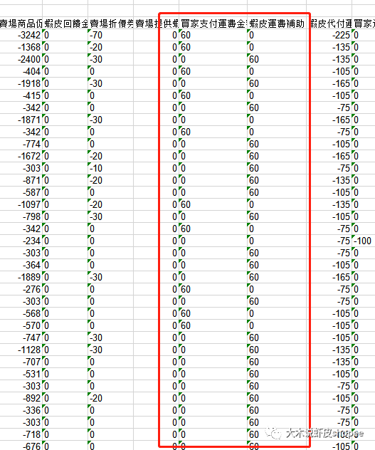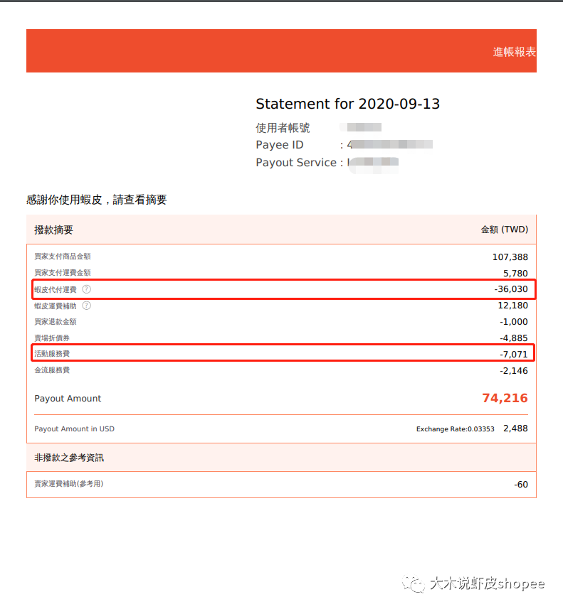 虾皮代付运费:我们所有订单合集总需要扣除的运费。例如这个月100单,总续重是100KG那么就是100000(KG)/500(每500G一个续重)*30/40台币(续重单位)=6000/8000台币。