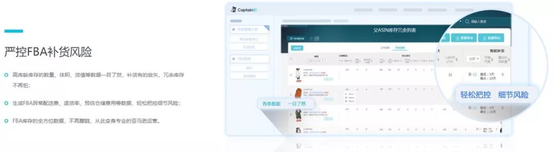 严控补货风险,必须做好FBA库存分析,我们船长利用FBA库存的各项指标,联系运营环节,开发了“FBA库存分析”功能,帮助卖家进行更高效的库存管理,包括合理补货与处理积货。在船长FBA看板中,罗列包括店铺总货值数据(FBA仓商品总成本)、需补货SKU数量情况、冗余SKU数量情况、库存天数、周转次数,辅以图表,上述各数据各有详细页面模块进行细节分析与展示。