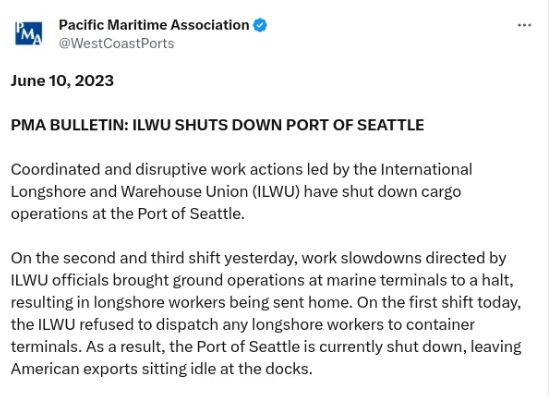 PMA表示在6月9日的第二班和第三班,工会官员指示的工作放缓导致海运码头的地面作业停止,导致码头工人被遣送回家。 在6月10日的第一班,ILWU工会拒绝派遣任何岸边工人到集装箱码头。 结果,西雅图港目前关闭。