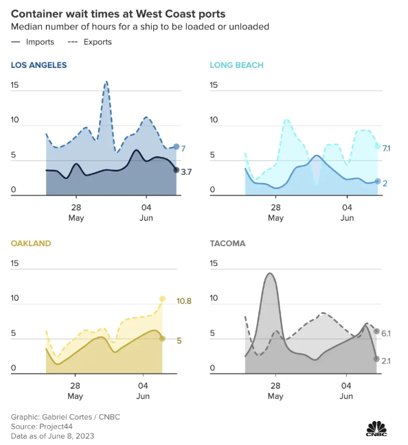 根据跟踪集装箱运输的Vizion为CNBC提供的独家数据,七天内通过奥克兰港的集装箱清关率为58%;长滩港为64%;洛杉矶港为62%。此外,进出西海岸港口的卡车平均转运时间也在增加。