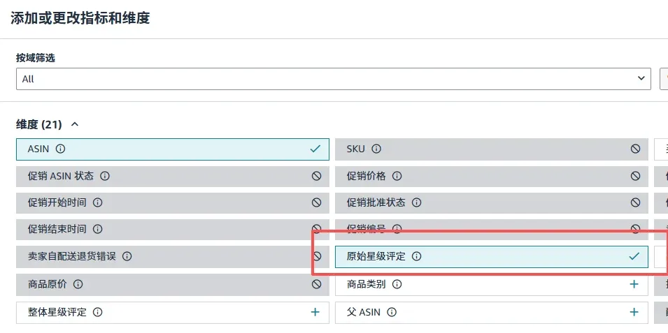 在弹出的添加或更改指标和维度选项卡中,勾选原始星级评定并保存,即可强制系统展示该核心数据。