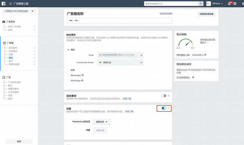 5.选择优惠广告的受众、版位、预算和排期。完成后点击继续。