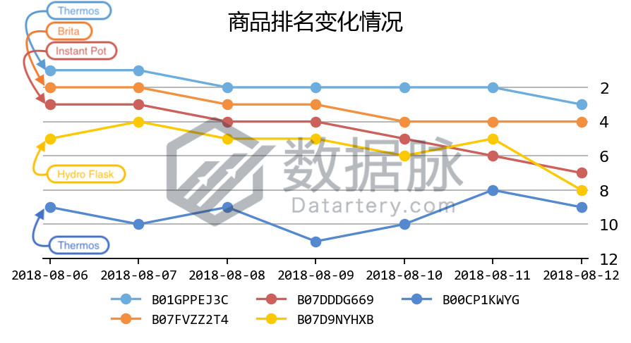 可以看到,在上周 Kitchen & Dining 品类的 Best Seller 榜单中,来自品牌Thermos的保温瓶一周内稳居 榜单前三,以平均排名1.86的领先优势位列商品综合排名首位;