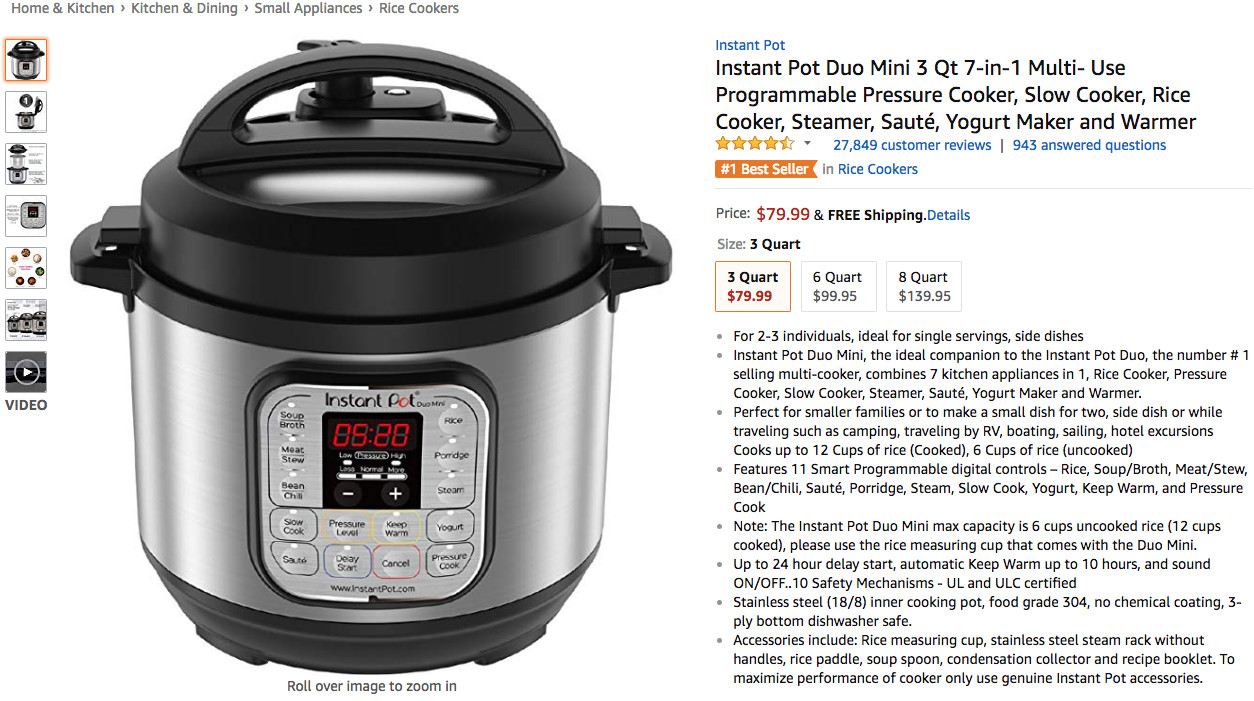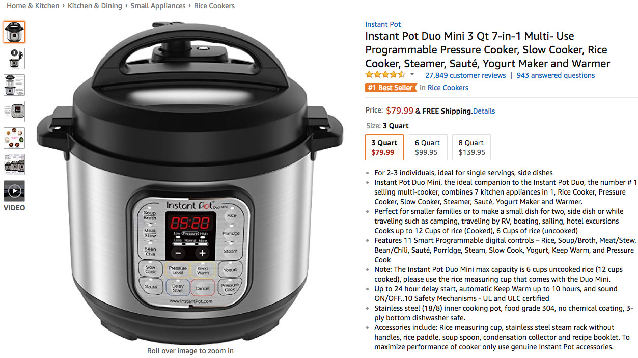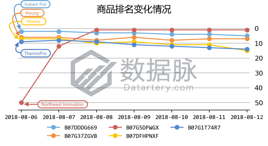 可以看到,在上周 Kitchen & Dining 品类的 Hot New Releases 榜单中,品牌Instant Pot的七合一智能压力锅在上周连续七天位列榜单前5,以平均排名3.29的优秀成绩位列商品综合排名首位;
