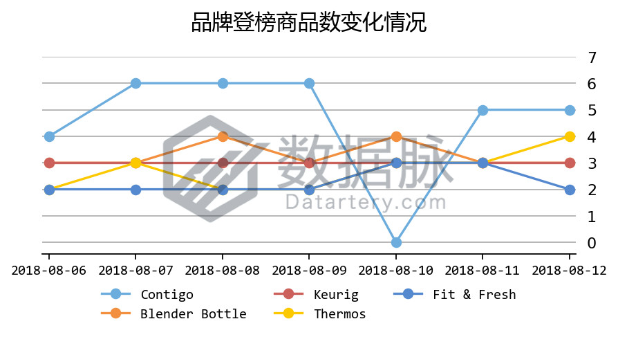 可以看到,在上周 Kitchen & Dining 品类的 Best Seller 榜单中,旅行杯品牌Contigo在8月7日-8月 9日连续上榜6款商品,以累积登榜32次、登榜11款商品的领先成绩位列品牌综合排名的第一;而品牌Blender Bottle、Keurig、Thermos、Fit & Fresh之间竞争则较为激烈,其中摇瓶品牌Blender Bottle以累积登榜23次位列品牌排名第二位。