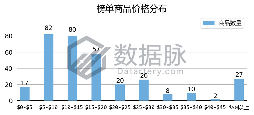 在上周 Kitchen & Dining 品类的 Hot New Releases 榜单中,商品最高价$599.00, 最低价$0.99,平均价格$35.18。骆探长(shujumai.com)发现,在上榜的商品中,其中定价于$5.00-$10.00价格段的商品数量最多,占比达 27.52%。此外,上周有20款上榜商品的价格超过了$50.00,占上榜商品总数的18.35%。相比于上期分析,该周上榜商品整体平均价格有较大幅 度下降,低价服饰类新品榜单竞争能力有所提升。