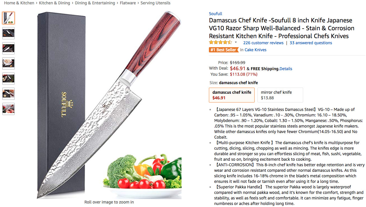 品牌Soufull的专业厨师刀取得了4 次跻身Movers & Shakers榜单前50的不错战绩,以平均排名18.0位列商品综合排名第二,其单日最大涨幅为953.0%, 涨幅较为惊人,骆探长(shujumai.com)注意到,该款商品目前仅拥有219.0条评论量,但平均星级高达4.4星,后续发展前景值得关注。