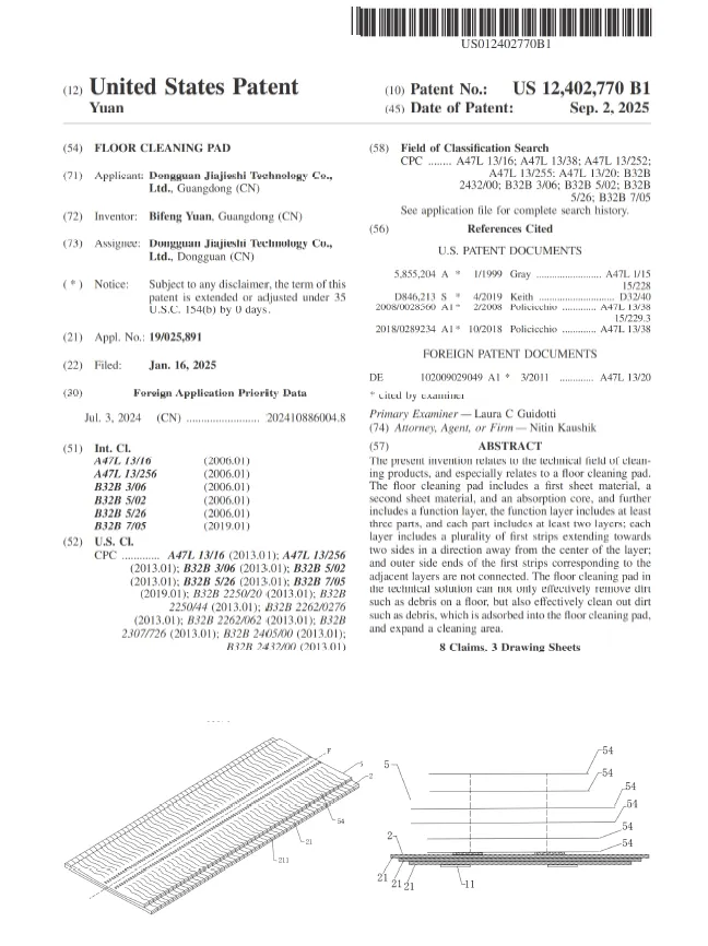 该专利主要解决了传统地板清洁垫存在的污垢易隐藏在折叠层中、难以彻底清洁、使用寿命短等技术问题。