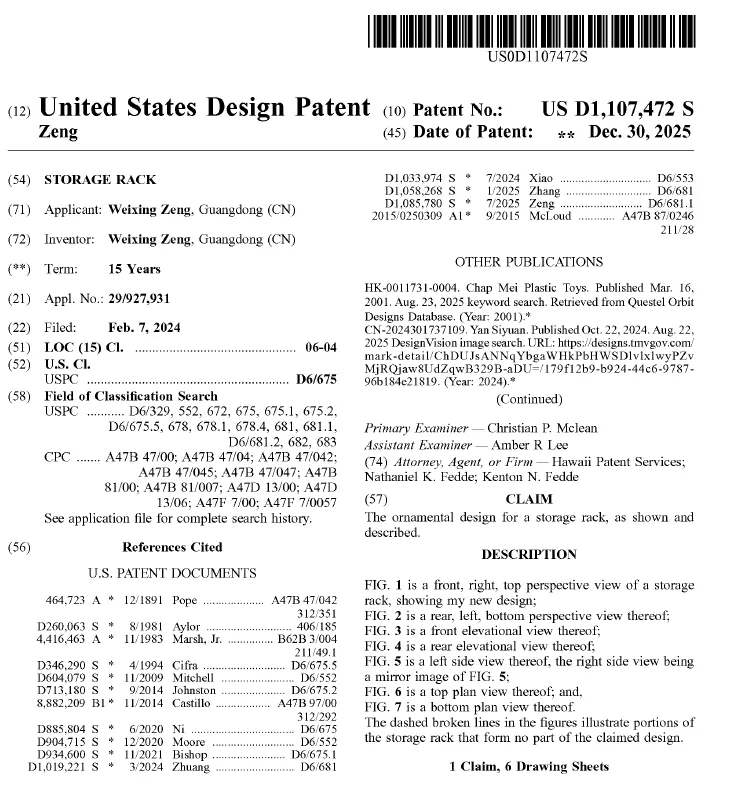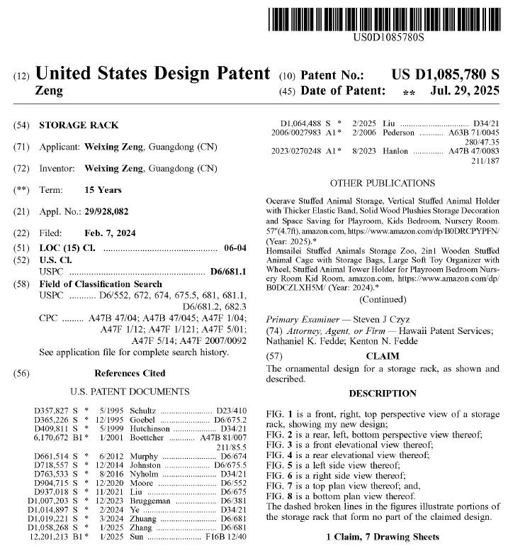 Weixing Zeng 是国人原告,专利产品是两款毛绒玩具收纳架: