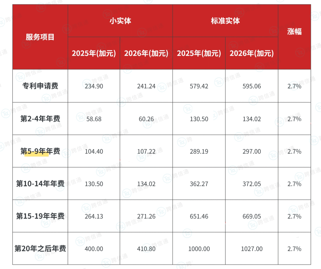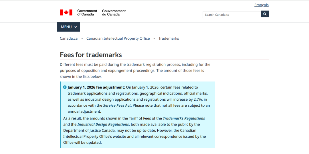 近日,加拿大知识产权局(CIPO)正式发布公告,明确自 2026 年 1 月 1 日起,依据加拿大《服务收费法》,专利、商标及外观设计等知识产权领域的官方费用将上调 2.7%。