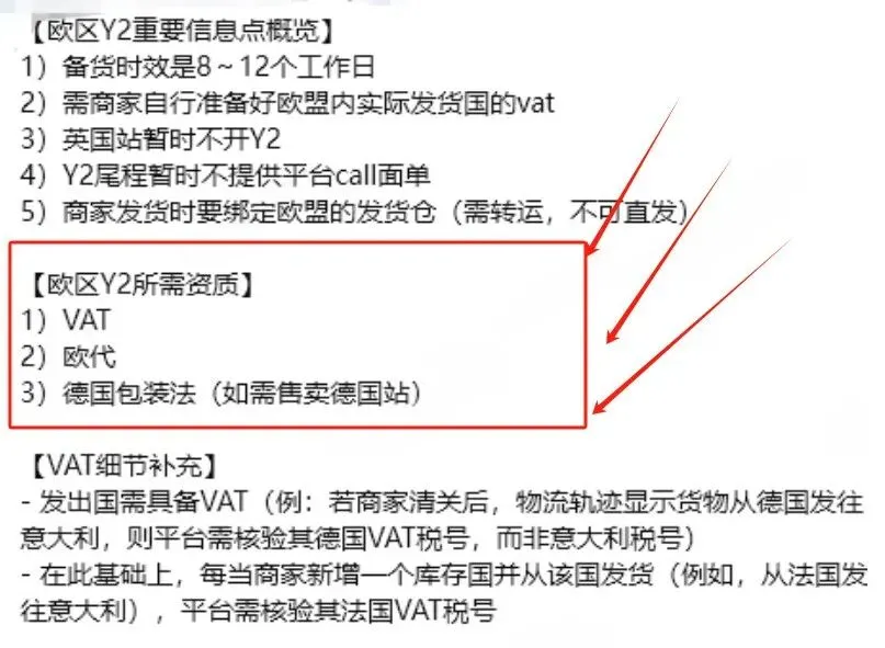 但两者有所区别,美区Y2强调尾程必须使用平台面单,无VAT要求;而欧盟Y2相对开放,允许使用第三方海外仓和部分非平台面单双边配合,但需提供与发货国相匹配的VAT税号。