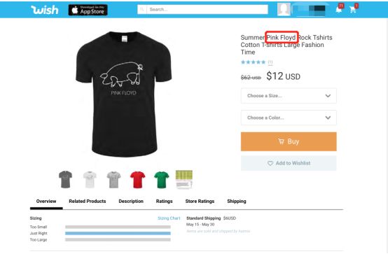 Pink Floyd (1987) Limited是根据英国法律组建的公司。在其注册商标中,卖家们最常在产品描述中使用“PINK FLOYD”一词,如下图所示: