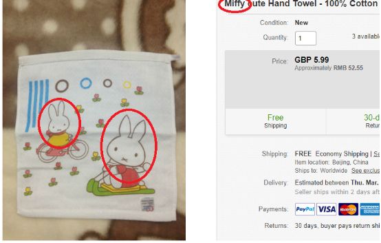 ”图案和“MIFFY”一词,如以下这位卖家在网店上所展示的产品就是如此: