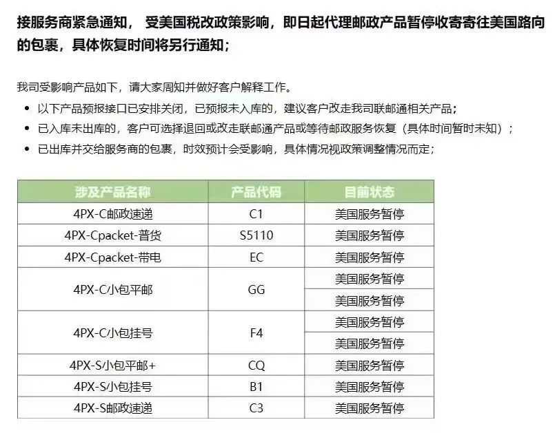 随着关税政策落地,紧接着在2月4日,美国邮政服务(USPS)宣布暂停接收从中国内地和中国香港寄出的包裹,但未说明具体原因。这一决定可能与近期中美贸易关系紧张有关。美国邮政这一举措,导致部分物流公司的线路被迫暂停,卖家不得不紧急寻找替代物流方案。