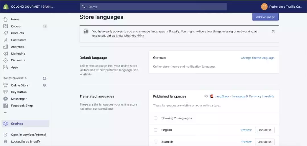 当你添加其他语言后,你可以管理从Shopify后台已经发布的语言。你还可以取消发布该语言,从而向客户隐藏该语言。所有以该语言展示的商店链接将会显示404错误“找不到页面”。