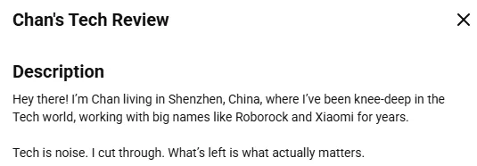 作为一名深耕“全球五金硅谷”深圳多年的科技观察者,Chan 拥有15万YouTube粉丝,曾与石头科技、小米等巨头深度合作,这使他能够洞穿复杂的参数,直接向受众传递产品背后的供应链逻辑与生活价值。